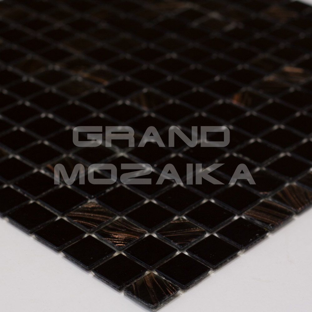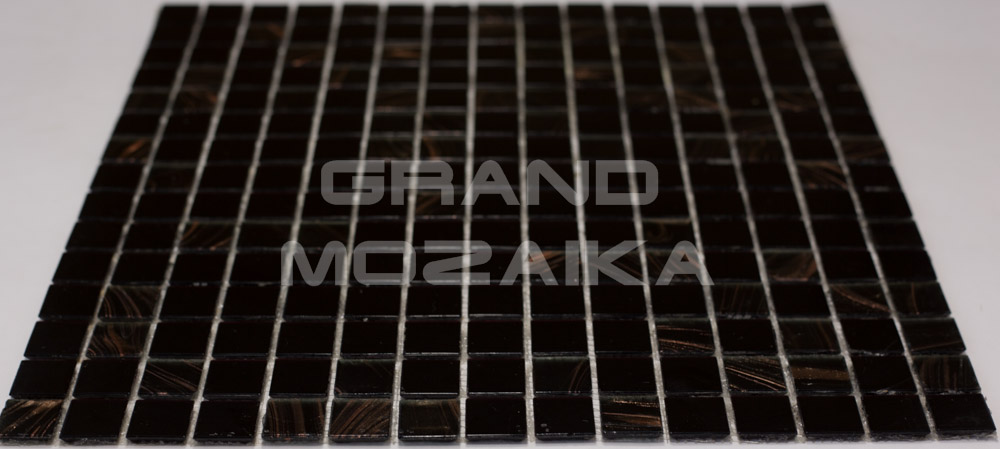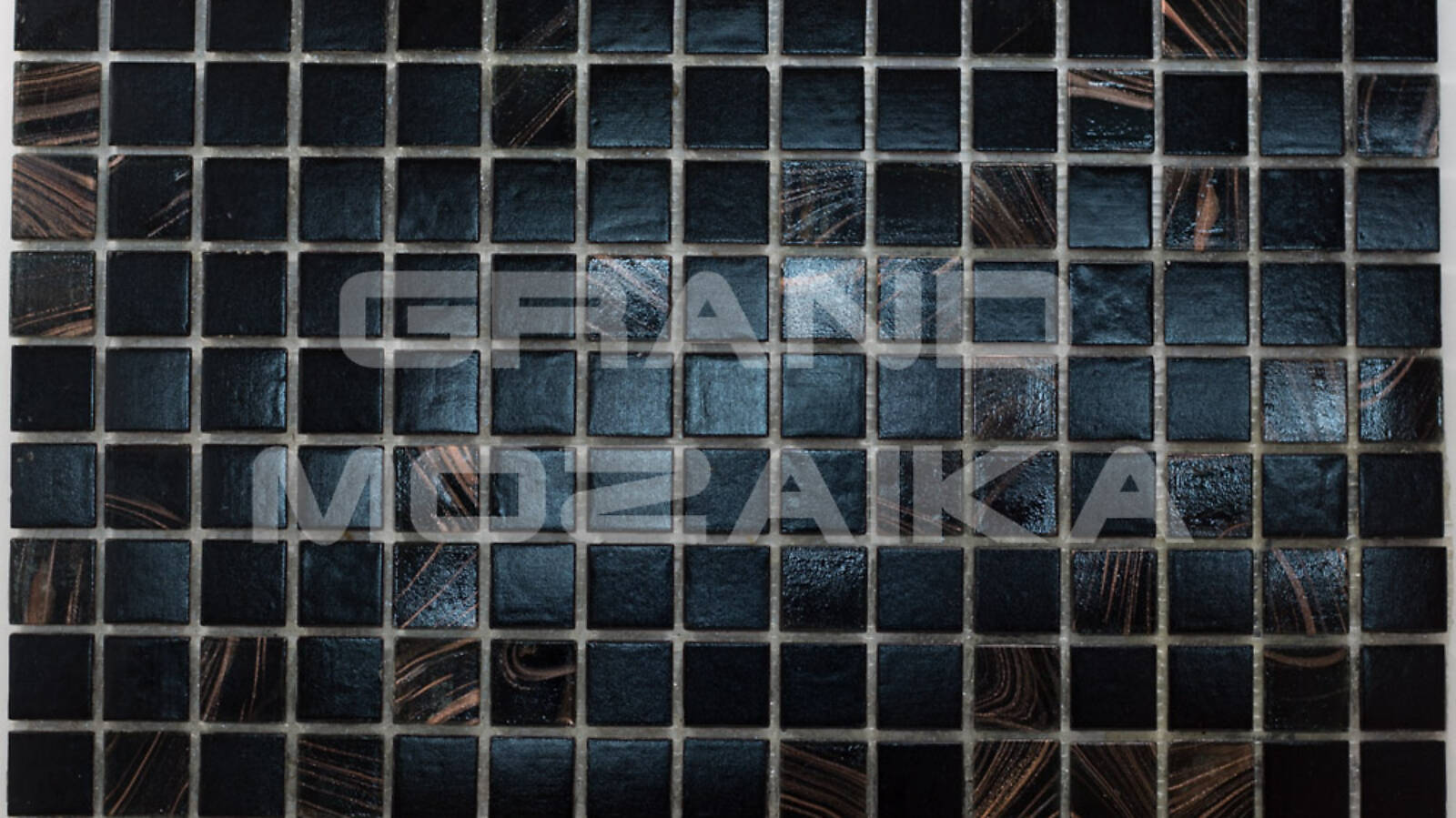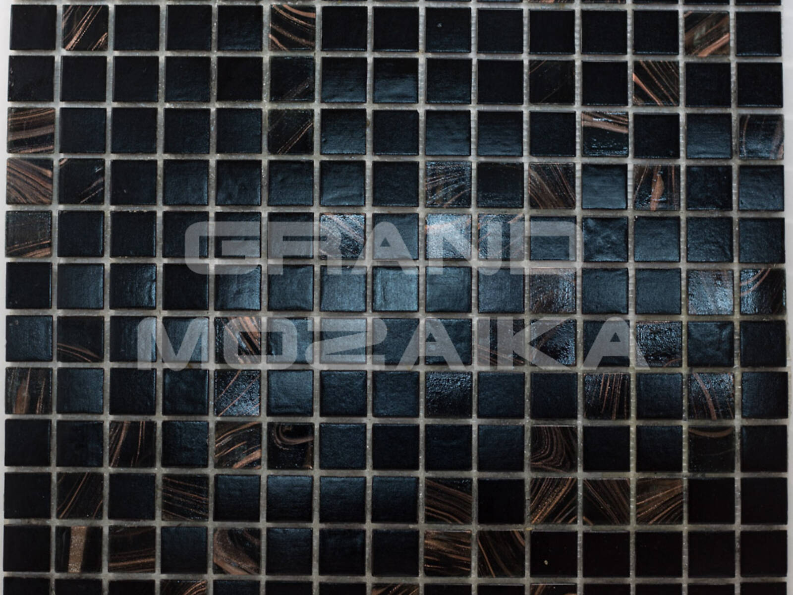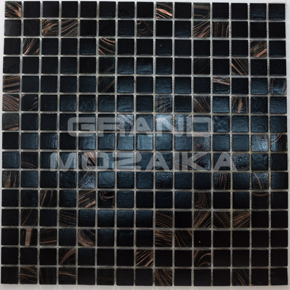 Мозаика серии Смеси. Состоит из стеклянных плиток черного цвета и плиток такого же цвета с золотыми разводами. Размер чипа 20х20 мм, толщина 4 мм. Размер листа 327х327 мм. Смеси цветов подходят и для бассейна, и для фасада, и для ванной комнаты, и для "фартука" кухни.